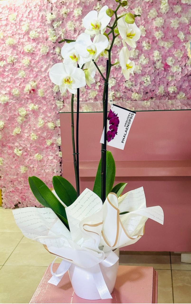 Planta de orquidea falenopsis natural empacada con papel decorativo koreano , un lazo cinta de raso, matera blanca.