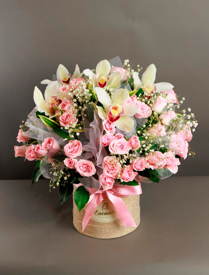 Caja dura con lazo en cinta de raso que contine 5 orquideas cinvidium, rosas mini, rosas medianas, tules, yipsohilias y finos follajes.