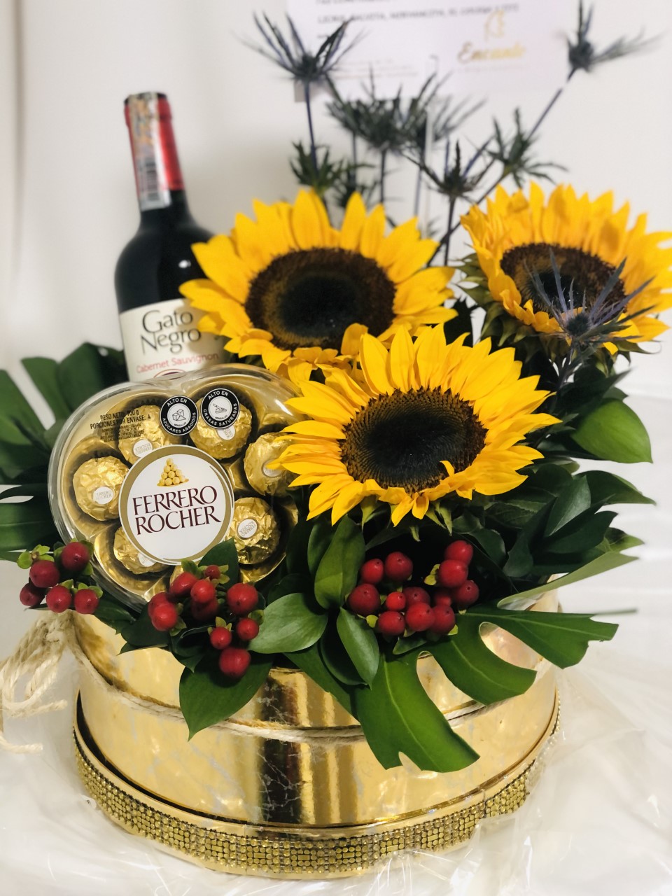 Caja de cartón dorado espejo, con 3 girasoles, botella de vino, chocolate corazon por 8 ferrero, hipérico, cardos y finos follajes