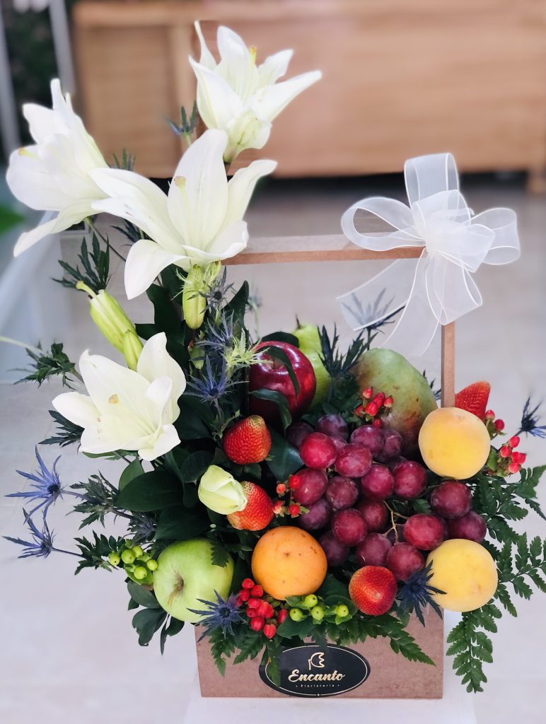 Canasta de madera rectangular con lirios, cardos, hipéricos, ruscus, con frutas : uvas, manzanas verde, roja, grandillas, pera, fresas, mango, durazno ubicadas a lado y lado de la canasta remata con un moño en cinta de agua