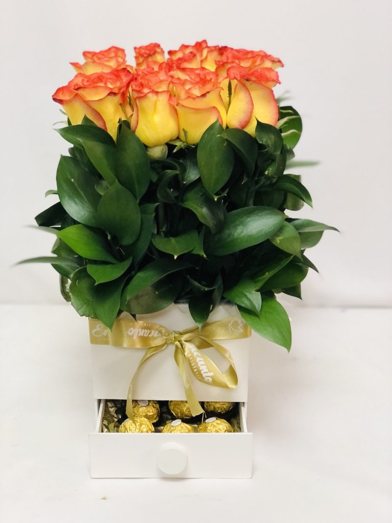 Cofres de madera con cinta de raso, 12 rosas a nivel amarilla confetti, rusco, 6 chocolates Ferrero Rocher