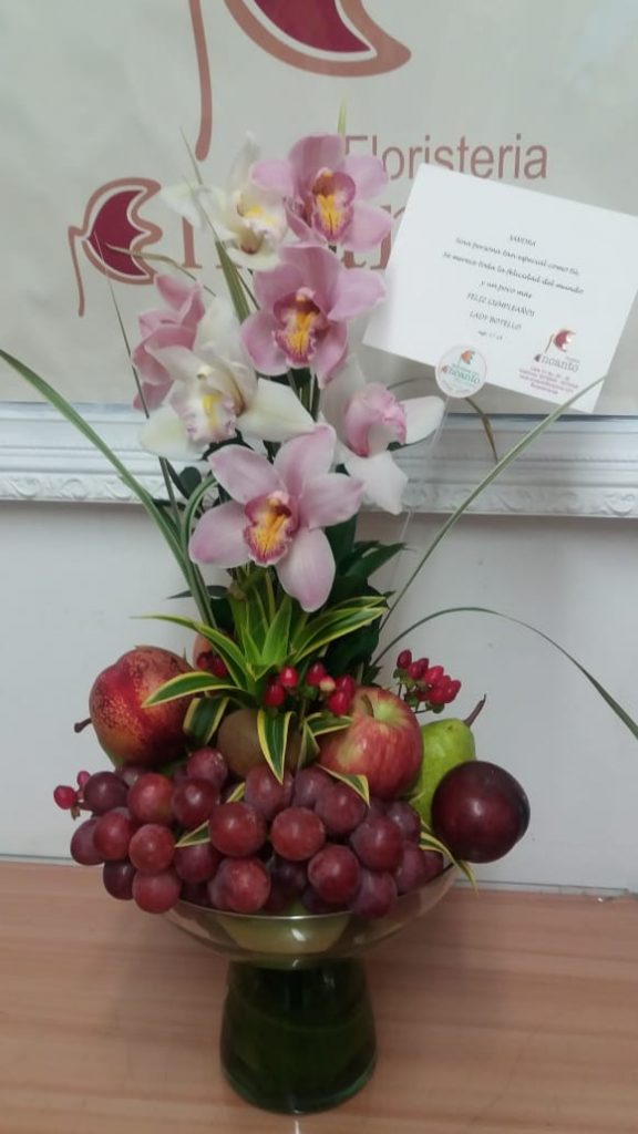 Base de vidrio en copa, con una vara de 6 orquideas cinvidium, canción de la inda, cintillas, y decorado con uvas, peras, manzanas verde y roja, ciruela.