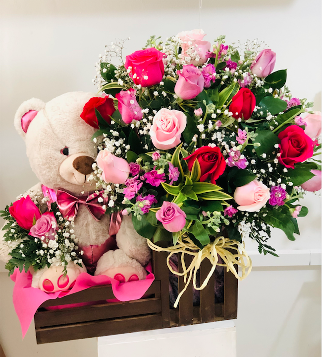 Hermoso arreglo floral en base de madera con peluche de excelente calidad acopañado de rosas lilas, rosadas y fucsias, yipsi, anción de la india, alelies, yipsophilias, finos follajes