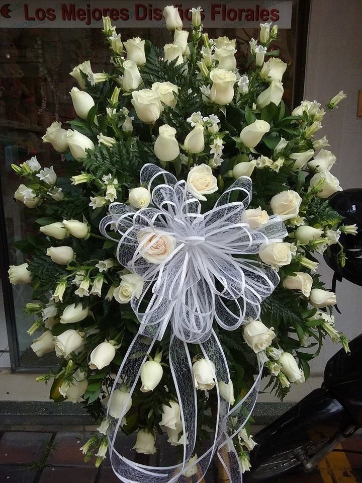Pedestal con 72 rosas blancas, montecasinos, finos follajes, coculos, ruscus, un moño grande en cinta spider
