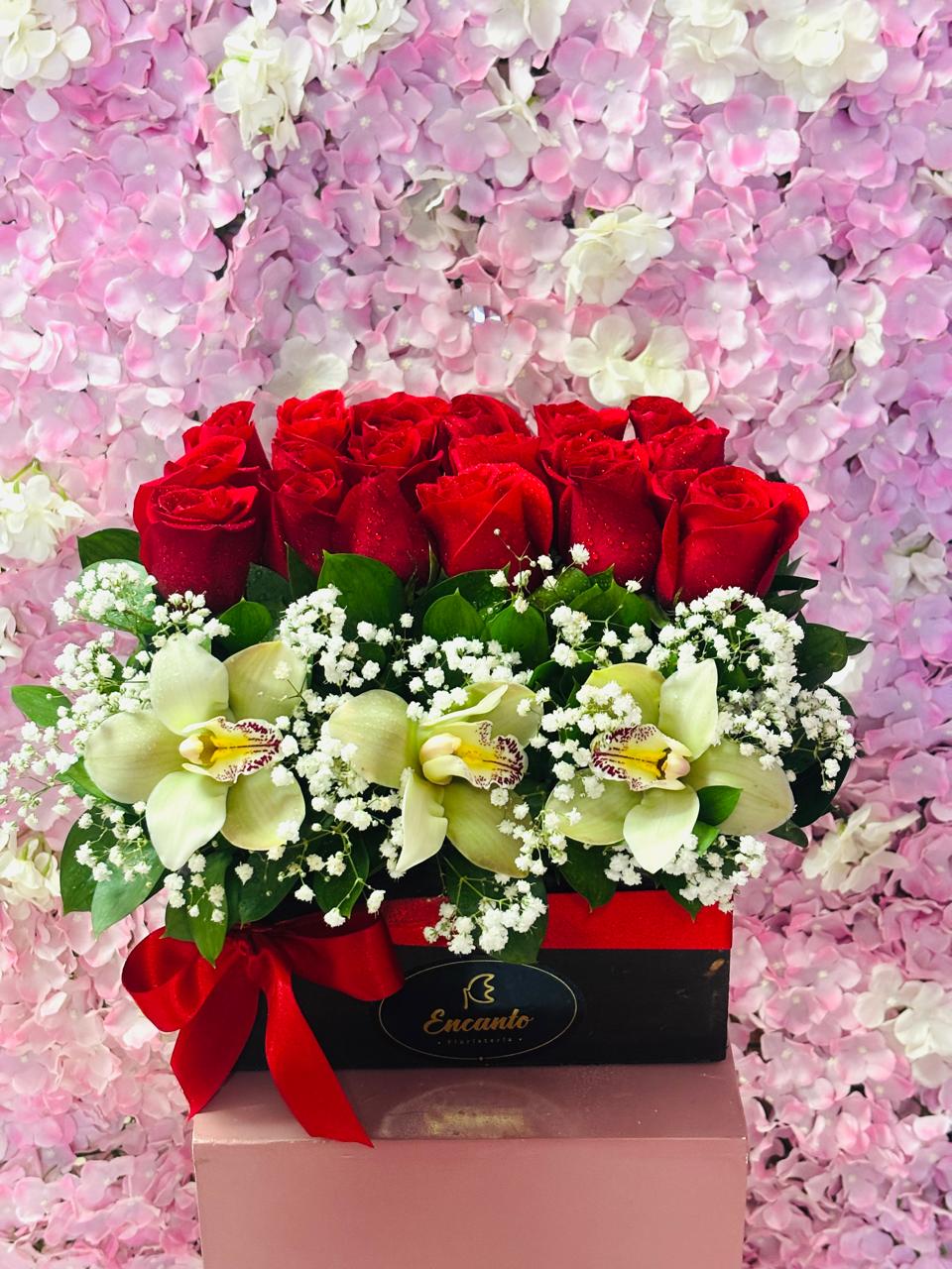 Base rectangular de madera rústica, con moño de raso, 18 rosas rojas a nivel, 3 orquídeas, rusco yipsophilias.