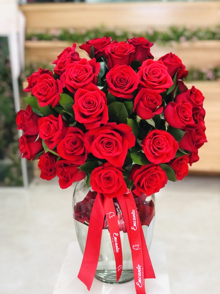 Jarron SAMARITANO mediano con agua y petalos, con 48 a 50 rosas rojas en forma redonda