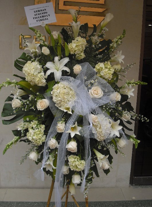 Pedestal con 7 hortensias, 18 rosas, bocas de dragón, montecasinos, hojas de balazo, hojas de dracena, cóculos, ruscus, lirios, moño grande en tul