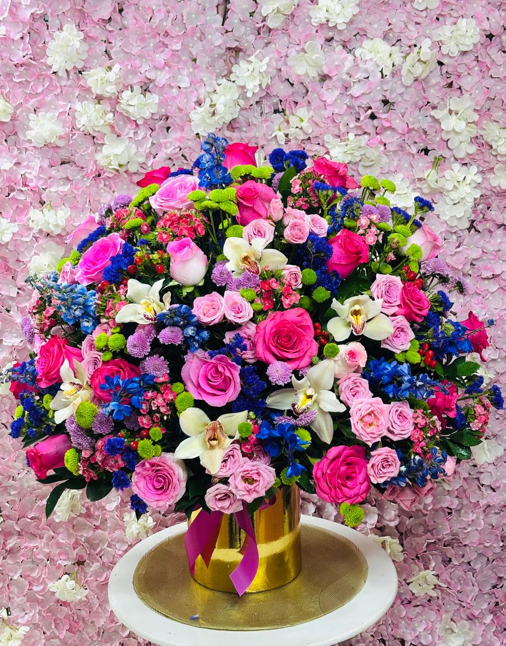 Caja de lujo dorada espejo, con 28 rojas fucsias, rosadas, 6 orquídeas cinvidium, coquetas Verdes, lilas, belladonnas, yipsis, finos follajes en forma de abanico.