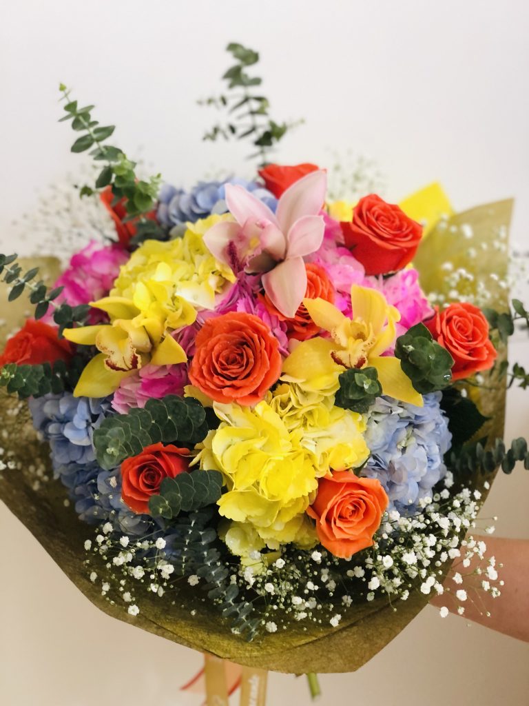 Ramillete con papel koreano, moño en raso,8 hortensias de colores, 5 rosas naranjas y 5 rosas fucsias, orquídeas, yipsophilias, eucalipto, ruscus