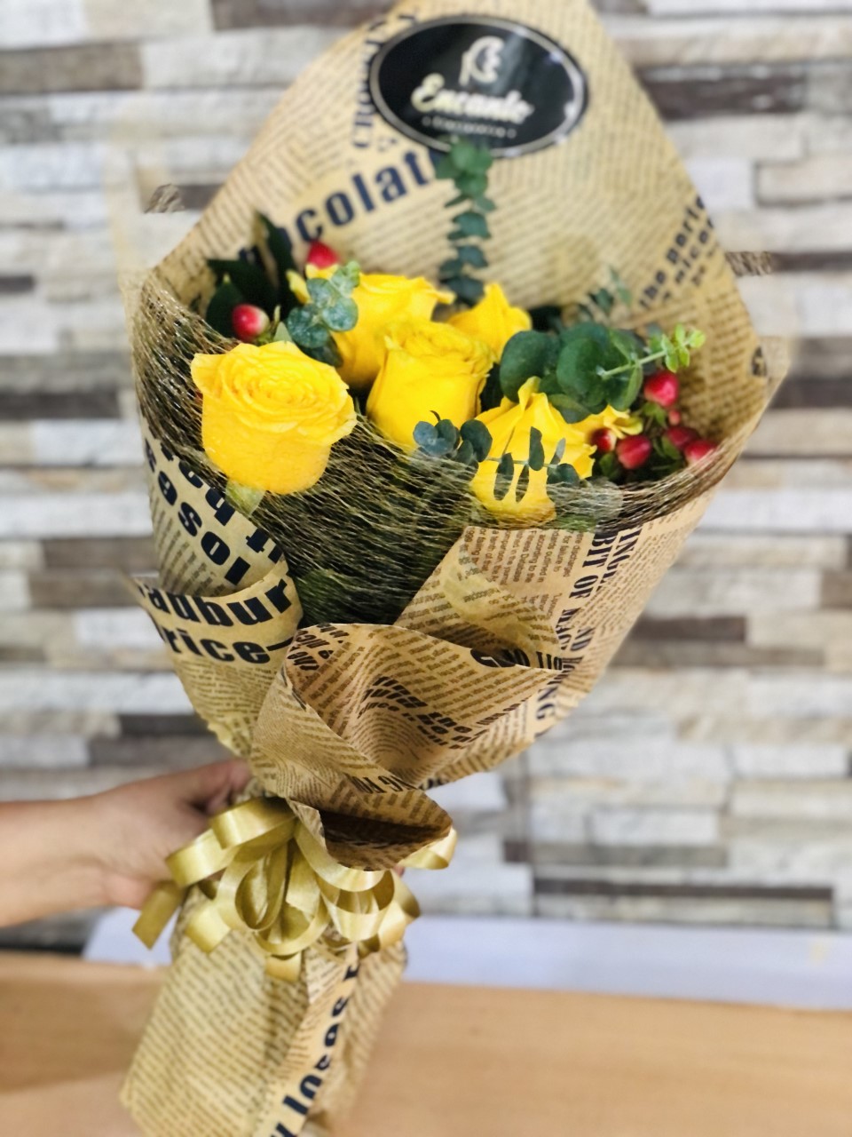 Ramillete con 6 rosas amarillas, papel Koreano, eucalipto, hipéricos,moño en cinta de raso, ruscus