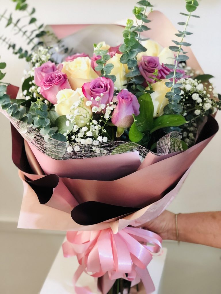Ramillete con papel Koreano en tendencia, moño cina de raso, 12 rosas colores pasteles, eucalipto, yipsophilia, finos follajes