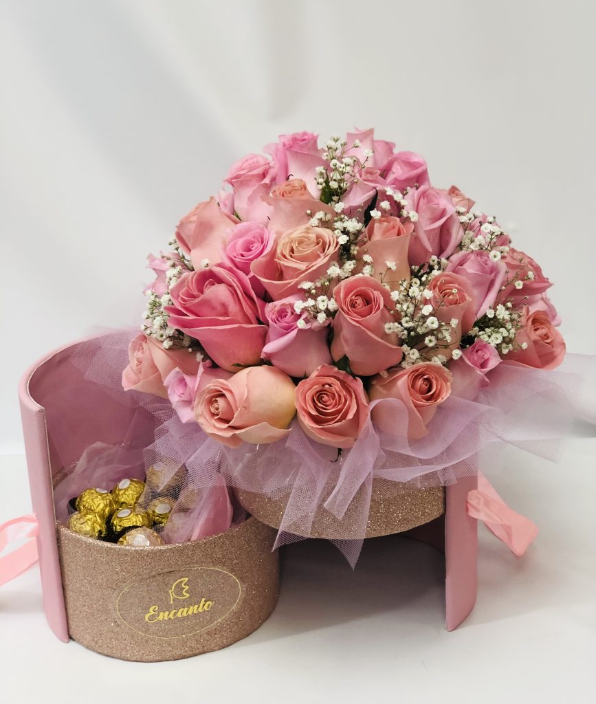 Caja doble compartimento con rosas rosadas, yipsophilias. Se entrega cerrada pero al abrirla encontraras una sorpresa de 12 choclates ferreros rocher